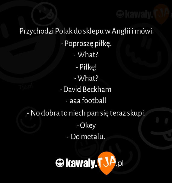 Przychodzi Polak do sklepu w Anglii i mowi: - Poprosze pilke. - What? - Pilke! - What? - David Beckham - aaa football - No dobra to niech pan sie teraz skupi. - Okey - Do metalu.