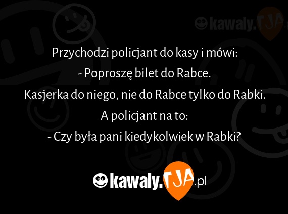 Przychodzi policjant do kasy i mowi: - Poprosze bilet do Rabce. Kasjerka do niego, nie do Rabce tylko do Rabki. A policjant na to: - Czy byla pani kiedykolwiek w Rabki?