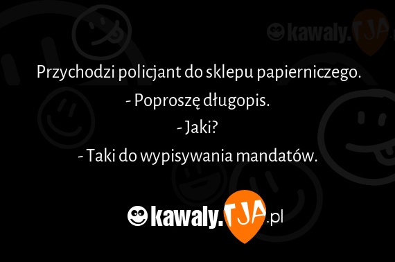 Przychodzi policjant do sklepu papierniczego. - Poproszę długopis. - Jaki? - Taki do wypisywania mandatów.