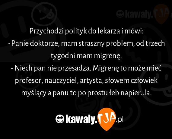 Przychodzi polityk do lekarza i mówi: - Panie doktorze, mam straszny problem, od trzech tygodni mam migrenę. - Niech pan nie przesadza. Migrenę to może mieć profesor, nauczyciel, artysta, słowem człowiek myślący a panu to po prostu łeb napier..la.