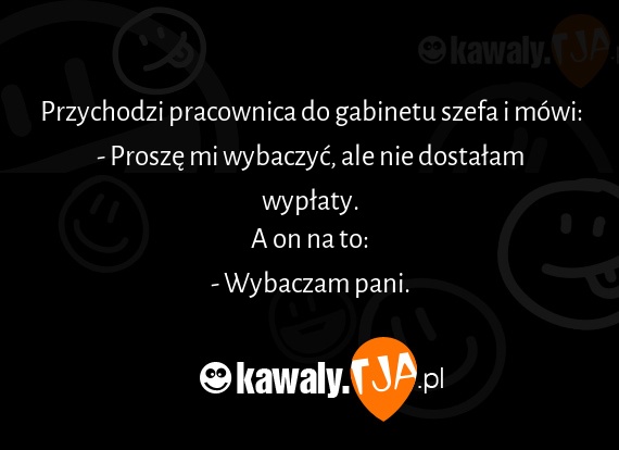 Przychodzi pracownica do gabinetu szefa i mówi: - Proszę mi wybaczyć, ale nie dostałam wypłaty. A on na to: - Wybaczam pani.