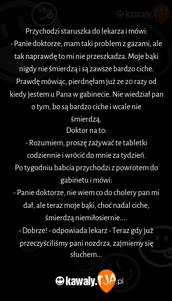 - Panie doktorze, nie wiem co do cholery pan mi dał, ale teraz moje bąki, choć nadal ciche, śmierdzą niemiłosiernie....