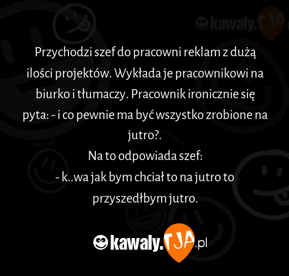 Przychodzi szef do pracowni reklam z dużą ilości projektów. Wykłada je pracownikowi na biurko i tłumaczy. Pracownik ironicznie się pyta: - i co pewnie ma być wszystko zrobione na jutro?.