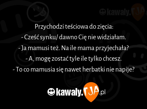 Przychodzi tesciowa do ziecia: - Czesc synku/ dawno Cie nie widzialam. - Ja mamusi tez. Na ile mama przyjechala? - A, moge zostac tyle ile tylko chcesz. - To co mamusia sie nawet herbatki nie napije?