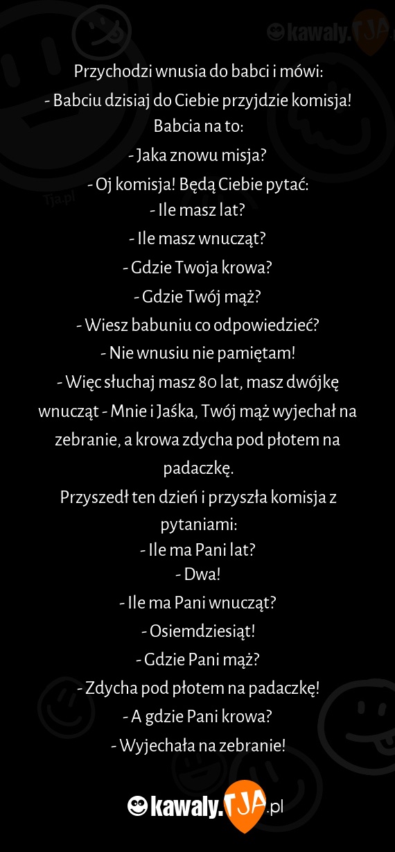 - Więc słuchaj masz 80 lat, masz dwójkę wnucząt - Mnie i Jaśka, Twój mąż wyjechał na zebranie, a krowa zdycha pod płotem na padaczkę.