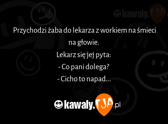 Przychodzi zaba do lekarza z workiem na smieci na glowie. Lekarz sie jej pyta: - Co pani dolega? - Cicho to napad...