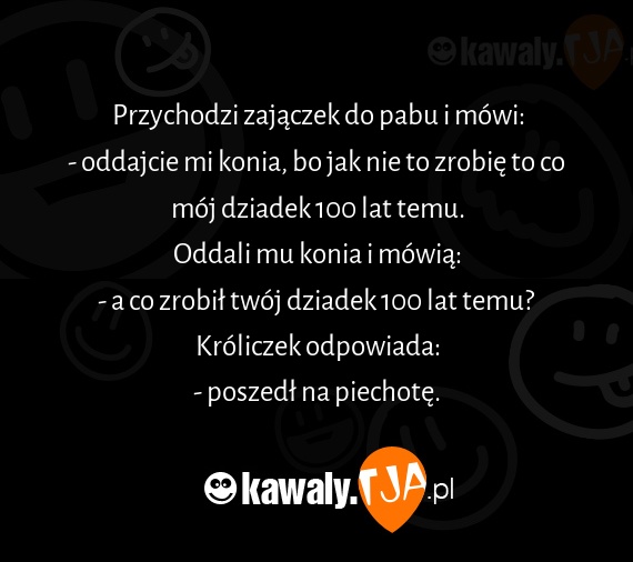 Przychodzi zajączek do pabu i mówi: - oddajcie mi konia, bo jak nie to zrobię to co mój dziadek 100 lat temu. Oddali mu konia i mówią: - a co zrobił twój dziadek 100 lat temu? Króliczek odpowiada: - poszedł na piechotę.