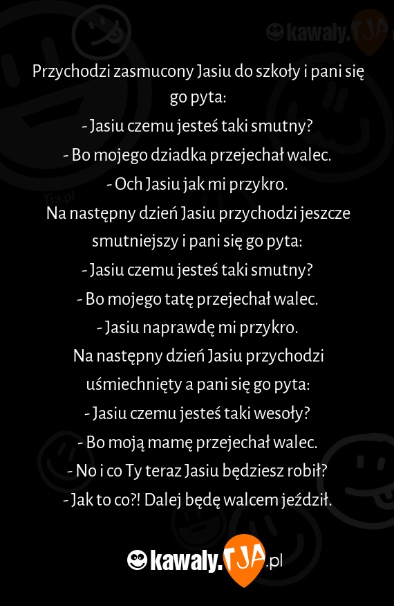 Na następny dzień Jasiu przychodzi jeszcze smutniejszy i pani się go pyta: