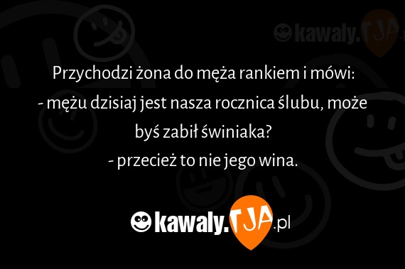 Przychodzi żona do męża rankiem i mówi: - mężu dzisiaj jest nasza rocznica ślubu, może byś zabił świniaka? - przecież to nie jego wina.