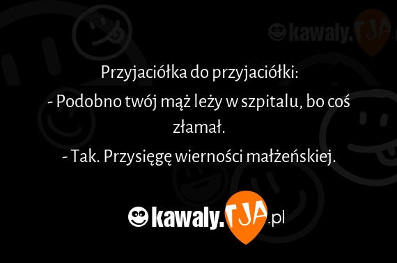 Przyjaciolka do przyjaciolki: - Podobno twoj maz lezy w szpitalu, bo cos zlamal. - Tak. Przysiege wiernosci malzenskiej.