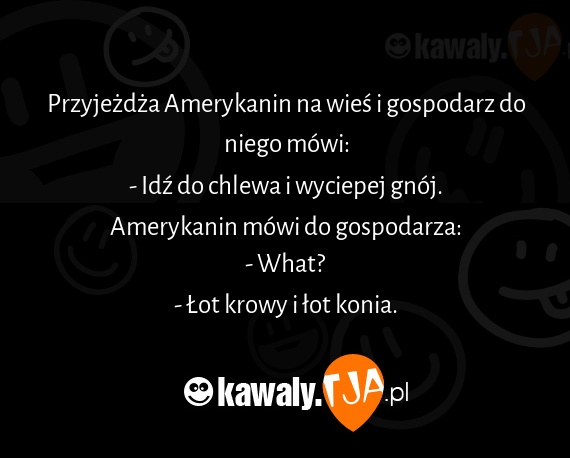 Przyjeżdża Amerykanin na wieś i gospodarz do niego mówi: - Idź do chlewa i wyciepej gnój. Amerykanin mówi do gospodarza: - What? - Łot krowy i łot konia.