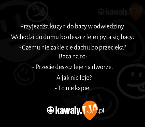 Przyjezdza kuzyn do bacy w odwiedziny. Wchodzi do domu bo deszcz leje i pyta sie bacy: - Czemu nie zakleicie dachu bo przecieka? Baca na to: - Przecie deszcz leje na dworze. - A jak nie leje? - To nie kapie.