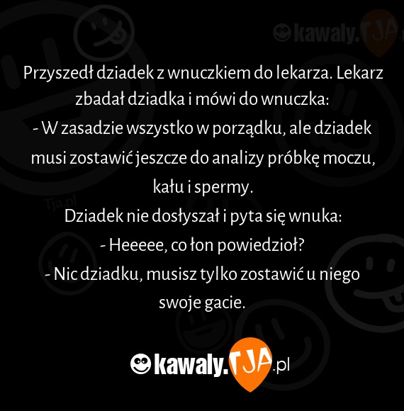 Przyszedł dziadek z wnuczkiem do lekarza. Lekarz zbadał dziadka i mówi do wnuczka: