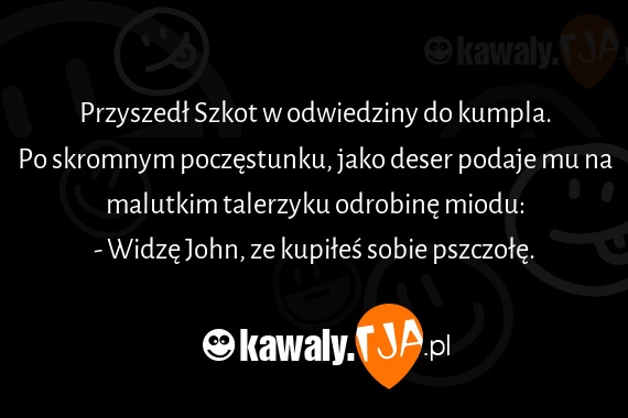 Przyszedl Szkot w odwiedziny do kumpla. Po skromnym poczestunku, jako deser podaje mu na malutkim talerzyku odrobine miodu: - Widze John, ze kupiles sobie pszczole.