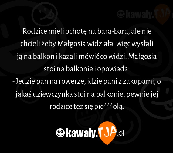 Rodzice mieli ochotę na bara-bara, ale nie chcieli żeby Małgosia widziała, więc wysłali ją na balkon i kazali mówić co widzi. Małgosia stoi na balkonie i opowiada: