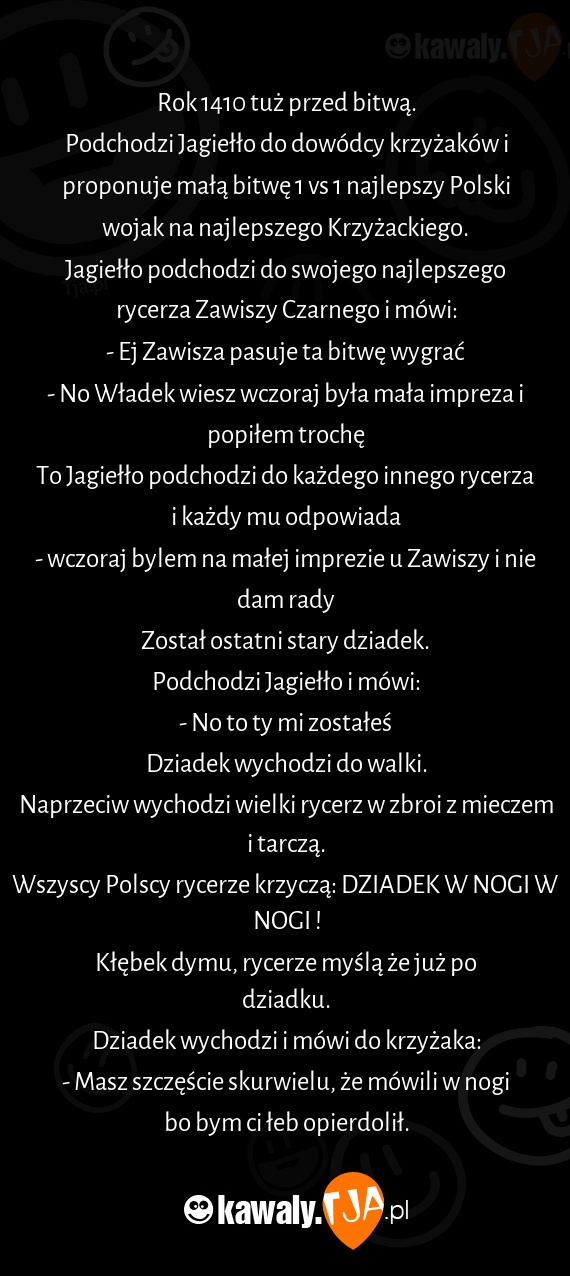 Jagiełło podchodzi do swojego najlepszego rycerza Zawiszy Czarnego i mówi:
