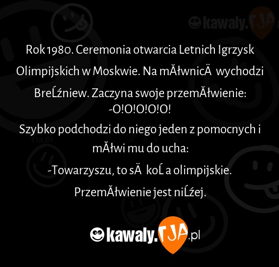 Rok 1980. Ceremonia otwarcia Letnich Igrzysk Olimpijskich w Moskwie. Na mównicę wychodzi Breżniew. Zaczyna swoje przemówienie: