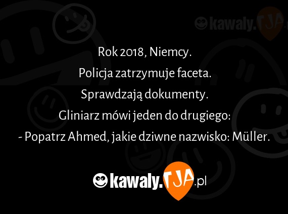 Rok 2018, Niemcy. Policja zatrzymuje faceta. Sprawdzają dokumenty. Gliniarz mówi jeden do drugiego: - Popatrz Ahmed, jakie dziwne nazwisko: Müller.