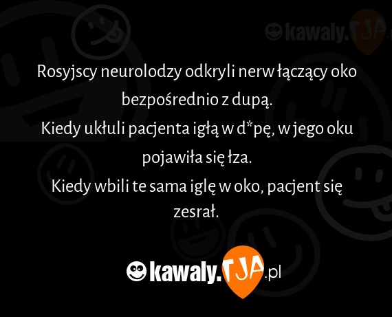 Rosyjscy neurolodzy odkryli nerw łączący oko bezpośrednio z dupą. Kiedy ukłuli pacjenta igłą w dupę, w jego oku pojawiła się łza. Kiedy wbili te sama iglę w oko, pacjent się zesrał.