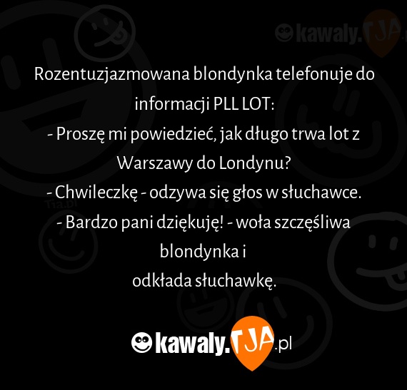 Rozentuzjazmowana blondynka telefonuje do informacji PLL LOT: - Proszę mi powiedzieć, jak długo trwa lot z Warszawy do Londynu? - Chwileczkę - odzywa się głos w słuchawce. - Bardzo pani dziękuję! - woła szczęśliwa blondynka i odkłada słuchawkę.