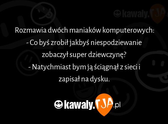 Rozmawia dwóch maniaków komputerowych: - Co byś zrobił jakbyś niespodziewanie zobaczył super dziewczynę? - Natychmiast bym ją ściągnął z sieci i zapisał na dysku.