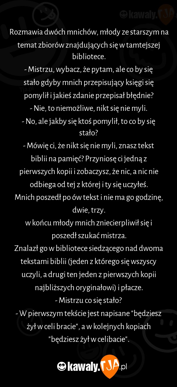 - Mistrzu, wybacz, że pytam, ale co by się stało gdyby mnich przepisujący księgi się pomylił i jakieś zdanie przepisał błędnie?