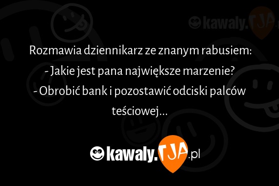 Rozmawia dziennikarz ze znanym rabusiem: - Jakie jest pana najwieksze marzenie? - Obrobic bank i pozostawic odciski palcow tesciowej...