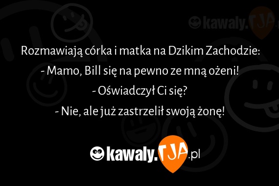 Rozmawiaja corka i matka na Dzikim Zachodzie: - Mamo, Bill sie na pewno ze mna ozeni! - Oswiadczyl Ci sie? - Nie, ale juz zastrzelil swoja zone!