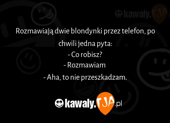 Rozmawiają dwie blondynki przez telefon, po chwili jedna pyta: - Co robisz? - Rozmawiam - Aha, to nie przeszkadzam.