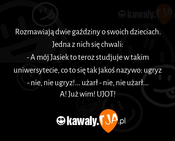Rozmawiają dwie gaździny o swoich dzieciach. Jedna z nich się chwali: - A mój Jasiek to teroz studjuje w takim uniwersytecie, co to się tak jakoś nazywo: ugryz - nie, nie ugryz!... użarł - nie, nie użarł... A! Już wim! UJOT!