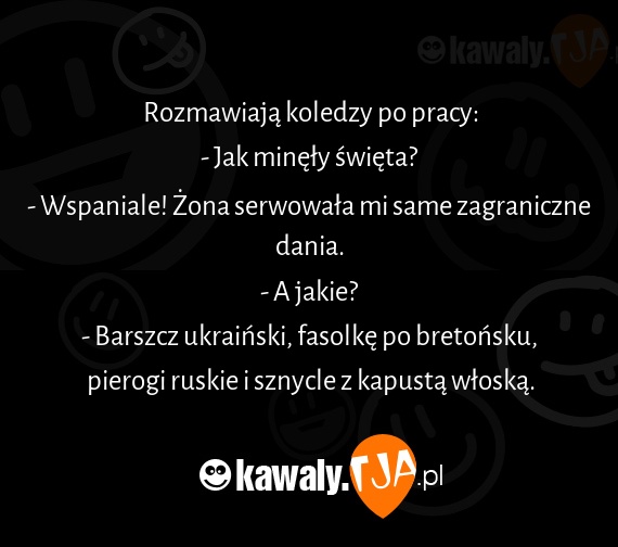 Rozmawiają koledzy po pracy: - Jak minęły święta? - Wspaniale! Żona serwowała mi same zagraniczne dania. - A jakie? - Barszcz ukraiński, fasolkę po bretońsku, pierogi ruskie i sznycle z kapustą włoską.