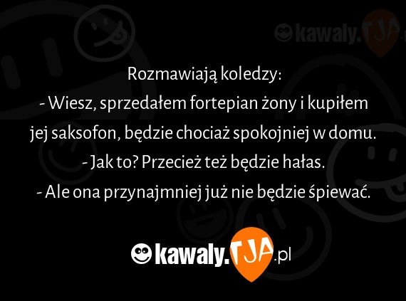 Rozmawiają koledzy: - Wiesz, sprzedałem fortepian żony i kupiłem jej saksofon, będzie chociaż spokojniej w domu. - Jak to? Przecież też będzie hałas. - Ale ona przynajmniej już nie będzie śpiewać.