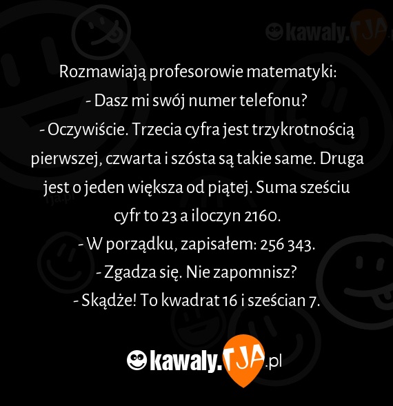 - Oczywiście. Trzecia cyfra jest trzykrotnością pierwszej, czwarta i szósta są takie same. Druga jest o jeden większa od piątej. Suma sześciu cyfr to 23 a iloczyn 2160.