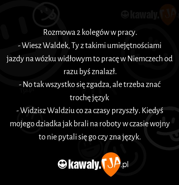 - Widzisz Waldziu co za czasy przyszły. Kiedyś mojego dziadka jak brali na roboty w czasie wojny to nie pytali się go czy zna język.
