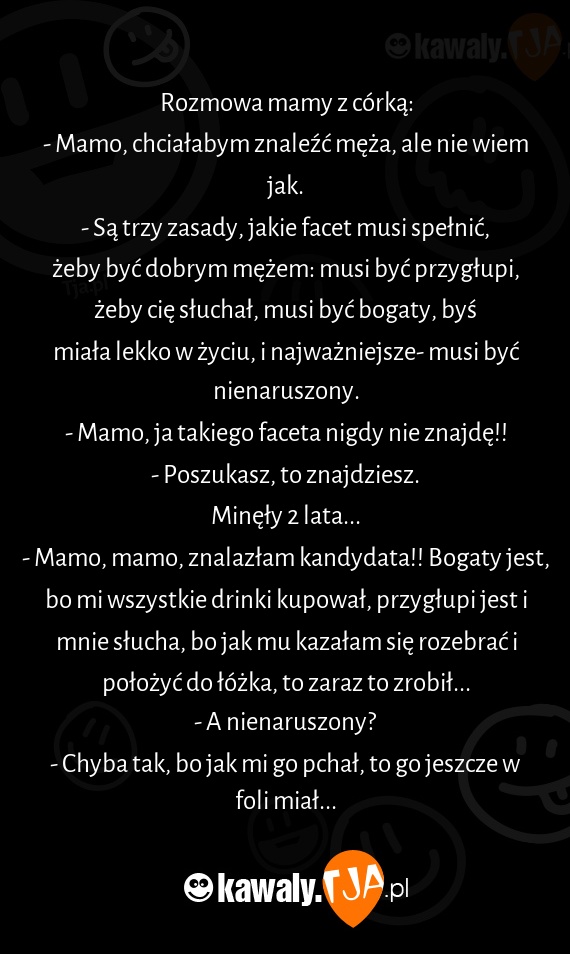 - Mamo, mamo, znalazłam kandydata!! Bogaty jest, bo mi wszystkie drinki kupował, przygłupi jest i mnie słucha, bo jak mu kazałam się rozebrać i położyć do łóżka, to zaraz to zrobił...