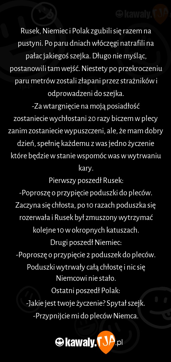 Rusek, Niemiec i Polak zgubili się razem na pustyni. Po paru dniach włóczęgi natrafili na pałac jakiegoś szejka. Długo nie myśląc, postanowili tam wejść. Niestety po przekroczeniu paru metrów zostali złapani przez strażników i odprowadzeni do szejka.