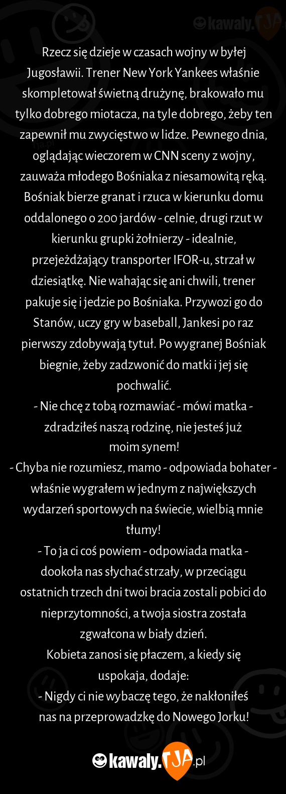 Rzecz się dzieje w czasach wojny w byłej Jugosławii. Trener New York Yankees właśnie skompletował świetną drużynę, brakowało mu tylko dobrego miotacza, na tyle dobrego, żeby ten zapewnił mu zwycięstwo w lidze. Pewnego dnia, oglądając wieczorem w CNN sceny z wojny, zauważa młodego Bośniaka z niesamowitą ręką. Bośniak bierze granat i rzuca w kierunku domu oddalonego o 200 jardów - celnie, drugi rzut w kierunku grupki żołnierzy - idealnie, przejeżdżający transporter IFOR-u, strzał w dziesiątkę. Nie wahając się ani chwili, trener pakuje się i jedzie po Bośniaka. Przywozi go do Stanów, uczy gry w baseball, Jankesi po raz pierwszy zdobywają tytuł. Po wygranej Bośniak biegnie, żeby zadzwonić do matki i jej się pochwalić.