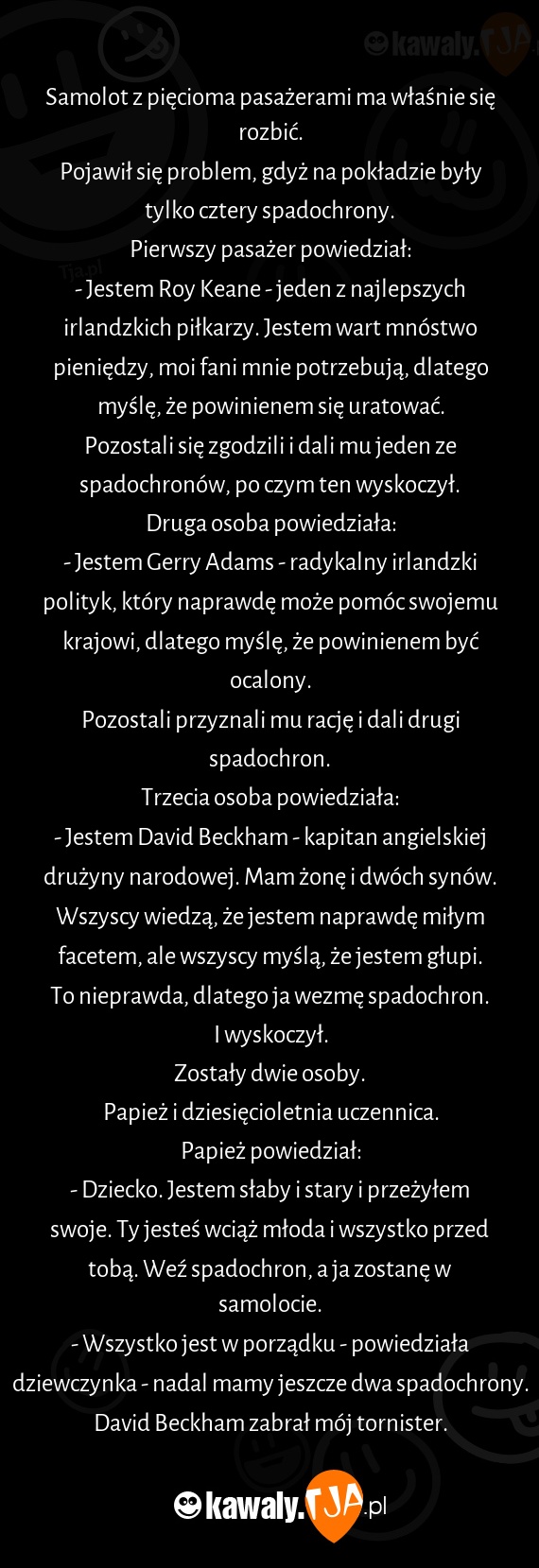 - Wszystko jest w porządku - powiedziała dziewczynka - nadal mamy jeszcze dwa spadochrony. David Beckham zabrał mój tornister.