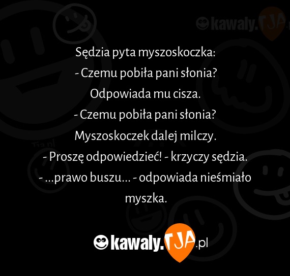 Sedzia pyta myszoskoczka: - Czemu pobila pani slonia? Odpowiada mu cisza. - Czemu pobila pani slonia? Myszoskoczek dalej milczy. - Prosze odpowiedziec! - krzyczy sedzia. - ...prawo buszu... - odpowiada niesmialo myszka.