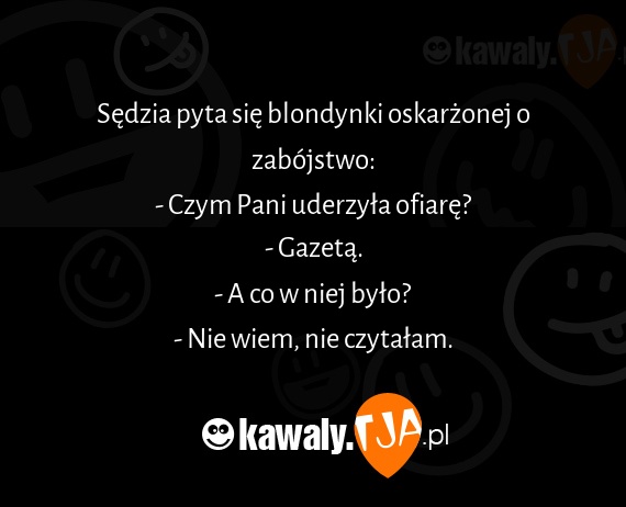 Sedzia pyta sie blondynki oskarzonej o zabojstwo: - Czym Pani uderzyla ofiare? - Gazeta. - A co w niej bylo? - Nie wiem, nie czytalam.