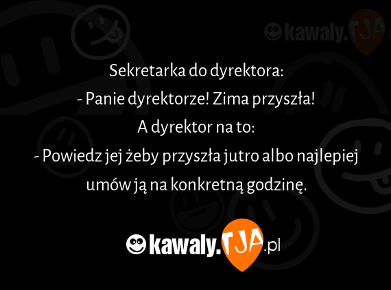 Sekretarka do dyrektora: - Panie dyrektorze! Zima przyszła! A dyrektor na to: - Powiedz jej żeby przyszła jutro albo najlepiej umów ją na konkretną godzinę.
