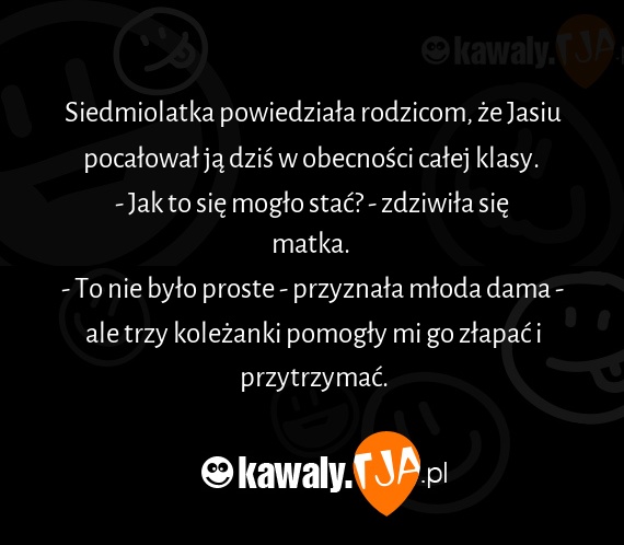 Siedmiolatka powiedziala rodzicom, ze Jasiu pocalowal ja dzis w obecnosci calej klasy. - Jak to sie moglo stac? - zdziwila sie matka. - To nie bylo proste - przyznala mloda dama - ale trzy kolezanki pomogly mi go zlapac i przytrzymac.