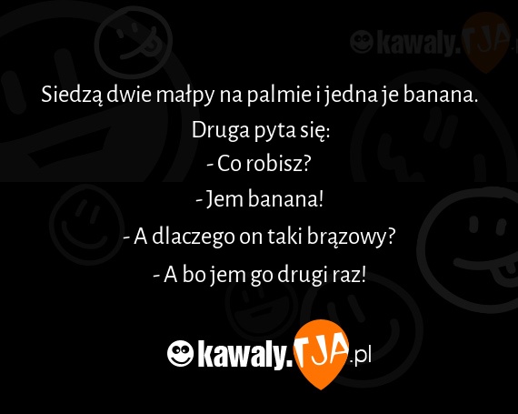 Siedzą dwie małpy na palmie i jedna je banana. Druga pyta się: - Co robisz? - Jem banana! - A dlaczego on taki brązowy? - A bo jem go drugi raz!
