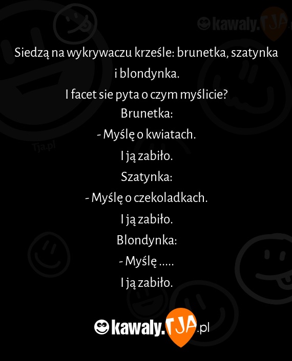 Siedzą na wykrywaczu krześle: brunetka, szatynka i blondynka. I facet sie pyta o czym myślicie? Brunetka: - Myślę o kwiatach. I ją zabiło. Szatynka: - Myślę o czekoladkach. I ją zabiło. Blondynka: - Myślę ..... I ją zabiło.