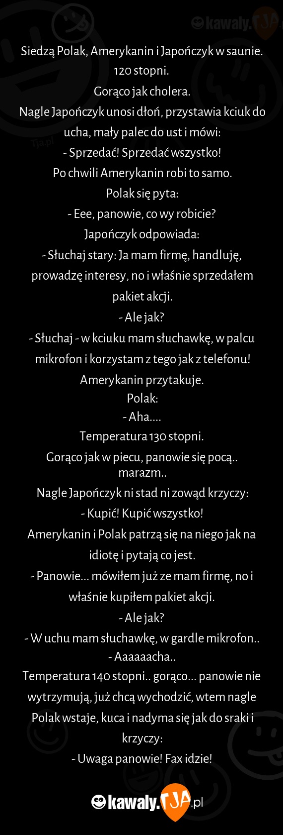Temperatura 140 stopni.. gorąco... panowie nie wytrzymują, już chcą wychodzić, wtem nagle Polak wstaje, kuca i nadyma się jak do sraki i krzyczy: