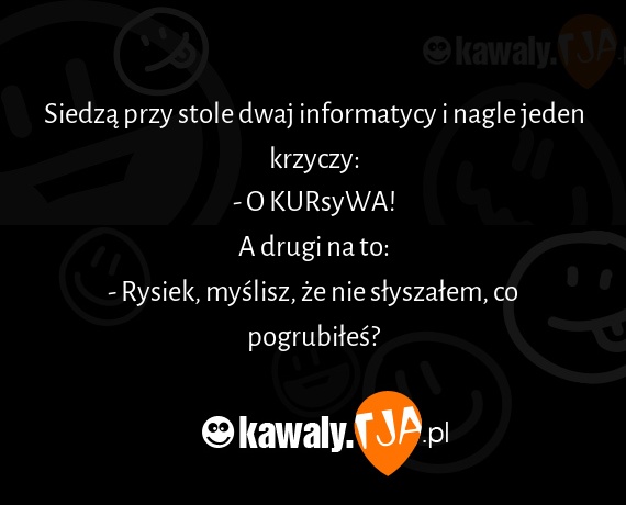 Siedza przy stole dwaj informatycy i nagle jeden krzyczy: - O KURsyWA! A drugi na to: - Rysiek, myslisz, ze nie slyszalem, co pogrubiles?