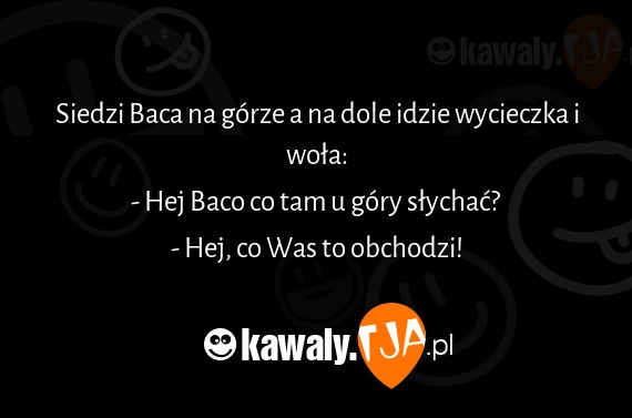 Siedzi Baca na górze a na dole idzie wycieczka i woła: - Hej Baco co tam u góry słychać? - Hej, co Was to obchodzi!