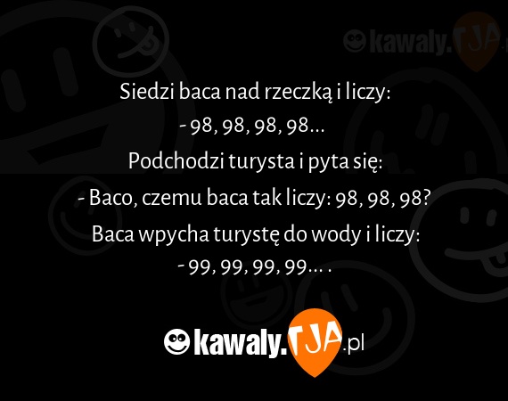 Siedzi baca nad rzeczką i liczy: - 98, 98, 98, 98... Podchodzi turysta i pyta się: - Baco, czemu baca tak liczy: 98, 98, 98? Baca wpycha turystę do wody i liczy: - 99, 99, 99, 99... .