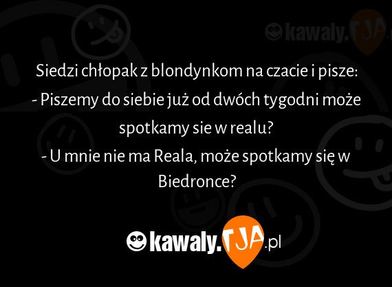 Siedzi chłopak z blondynkom na czacie i pisze: - Piszemy do siebie już od dwóch tygodni może spotkamy sie w realu? - U mnie nie ma Reala, może spotkamy się w Biedronce?