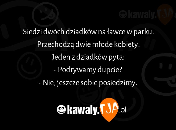 Siedzi dwoch dziadkow na lawce w parku. Przechodza dwie mlode kobiety. Jeden z dziadkow pyta: - Podrywamy dupcie? - Nie, jeszcze sobie posiedzimy.